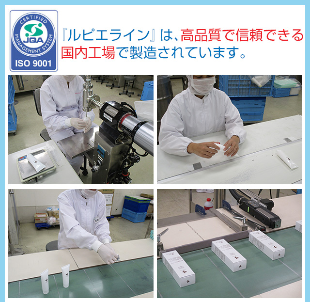 デリケートな症状のケア商品だからこそ、高品質で信頼できるのは当たり前のこと。『ルピエライン』は、医薬品と遜色のない水準で製造管理された国内工場で、ひとつひとつ、決して妥協せずに製造を行っています。もちろん、品質についても徹底した管理と検査を行い、万全の商品を皆さまにお届け致します。工場では、品質マネジメントシステムの国際規格ISO9001を取得しております。 |