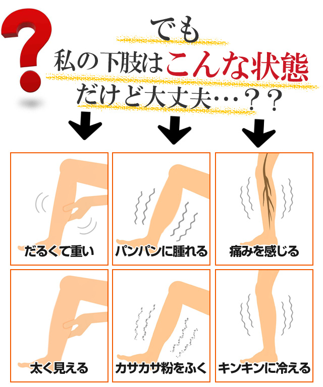 ![]() 夕方になると足がむくんでだるくて重い ![]() 特にふくらはぎ・足首・足の甲のむくみが酷い ![]() 足がパンパンに腫れて靴やブーツがきつくて痛い ![]() 指で押すとへこんだまま戻ってこない ![]() なかなか疲れが取れず足がつりやすくなる ![]() ひどい時は朝までむくんで靴下の跡も消えない ![]() 特に足先がキンキンに冷えて感覚がなく痛い ![]() 手足がヒンヤリ冷えてなかなか寝付けない ![]() カサカサに乾燥して粉を吹いたりひび割れたりする ![]() 乾燥して痒くて掻きむしって血が出ることもある |