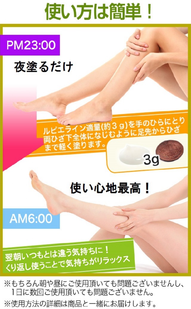 それ以来、ずっとルピエラインを愛用しているのですが、使用感もとても良く、すーっと伸びてくれるのでとても塗りやすくて、広範囲に塗っても疲れることがありません。サラサラしっとりしていてベタつくことがありません。香料も入っていなので、他のクリームでたまにあった、香りをかぎ続けて気分が悪くなってしまうこともありません。足がだるくて眠れないことも、布団に入った際にいつも寒くて足をすり合わせていたことも、ケアできそうです。
