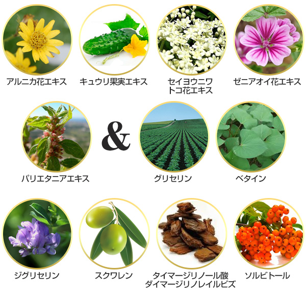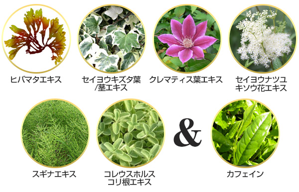 トリ(カプリル酸/カプリン酸)グリセリル、パルミチン酸イソプロピル、エチルヘキサン酸セチル、BG、イソペンチルジオール、ペンチレングリコール、グリセリン、(アクリル酸ヒドロキシエチル/アクリロイルジメチルタウリンNa)コポリマー、ポリソルベート60、ベタイン、ジグリセリン、スクワラン、ダイマージリノール酸ダイマージリノレイルビス(ベヘニル/イソステアリル/フィトステリル)、ソルビトール、バニリルブチル、イソステアリン酸ソルビタン、トコフェロール、ショウガ根エキス、水添レシチン、トウガラシ果実エキス、インドナガコショウ果実エキス、トウキ根エキス、ヒバマタエキス、セイヨウキズタ葉/茎エキス、クレマティス葉エキス、セイヨウナツユキソウ花エキス、スギナエキス、クダモノトケイソウ果実エキス、ワレモコウエキス、アルニカ花エキス、キュウリ果実エキス、セイヨウニワトコ花エキス、ゼニアオイ花エキス、パリエタリアエキス、変性アルコール、カフェイン、コレウスホルスコリ根エキス、クロレラ/シロバナルーピンタンパク発酵物クエン酸、エタノール、フェノキシエタノール