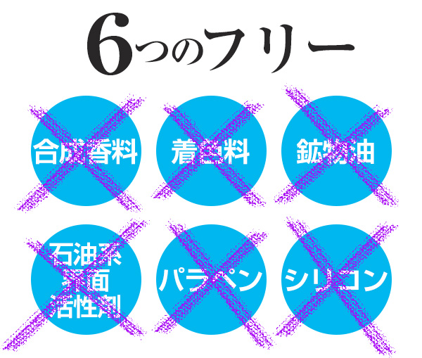 “ルピエライン”は「お肌へのやさしさ」を第一に考え、以下の6つの添加物や刺激物の配合に配慮しました。こだわり続けた成分ですので敏感肌の方にもご愛用頂いております。 |